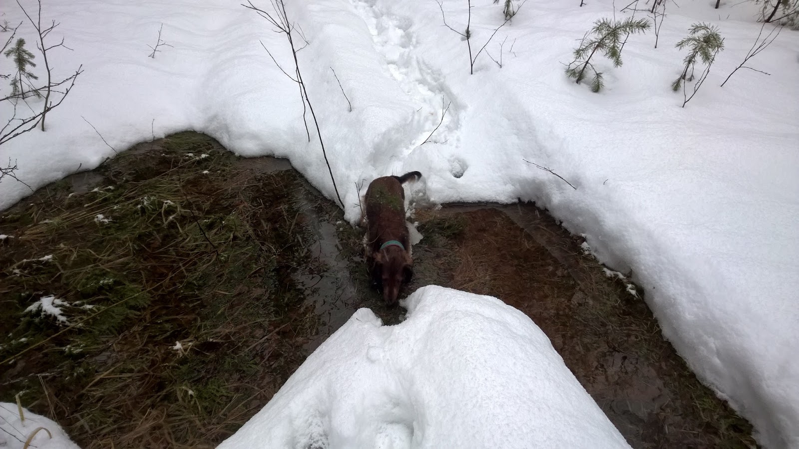 Loppiaisena tehtiin pitkähkö metsälenkki. Emäntä arveli, että kaikki innokkaat, sporttiset kyläläiset ovat siellä tampanneet polkuja koko alkuvuoden, että sen kuin vain tassutellaan menemään. Ei osunut arvio ihan oikeaan. Joku yksinäinen sielu (jolla kuitenkin oli jalat) oli sitkeästi kahlannut hangessa ennen meitä, mutta tämän polulle muodostuneen ojan jälkeen sekin oli suunnistanut suoraan mäen yli takaisin tielle.