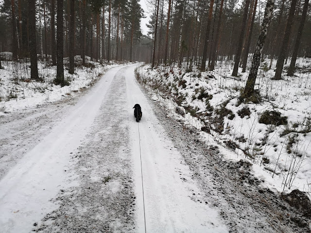 Roni: Tänään oli ihana ulkoilusää, kun oli satanut vähän lunta, oli pikkuisen pakkasta ja aurinko paistoi. Huonoa oli kuitenkin se, että uusi lumi tarttui koko ajan tassun pohjiin lumikokkareiksi ja täytyi pysähtyä tuon tuosta putsaamaan jalkoja. Meillähän on se tapa, että me jäämme Lucy-neidin kanssa paikallemme istumaan tassu ylös kohotettuna, että Emäntä tietää tulla auttamaan jalan putsauksessa, mutta hän oli toivottoman hidas kulkemaan edestakaisin tuolla pehmeällä lumipeitteellä.