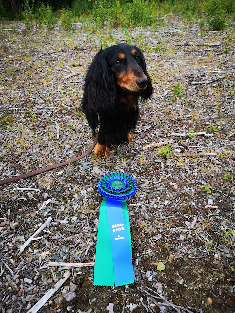 Lopulta tulokset julkistettiin: Tuisku sai vihdoin myös ykköstuloksen ja hän oli päivän paras koira! (Hän ei vielä valioitunut, mutta kun hän jonakin päivänä valioituu Suomesta tai Ruotsista, niin hänestä tulee samalla myös Norjan jälkivalio.) Spanieli oli tällä kertaa kakkonen ykköstuloksellaan. Ja minä olin taas kolmas! Emännän toilailu oli maksanut meille pisteitä, mutta tulos oli silti ykkönen. Hidastaminen sentään onnistui, kun tämä toinen jälki kesti 23 minuuttia.